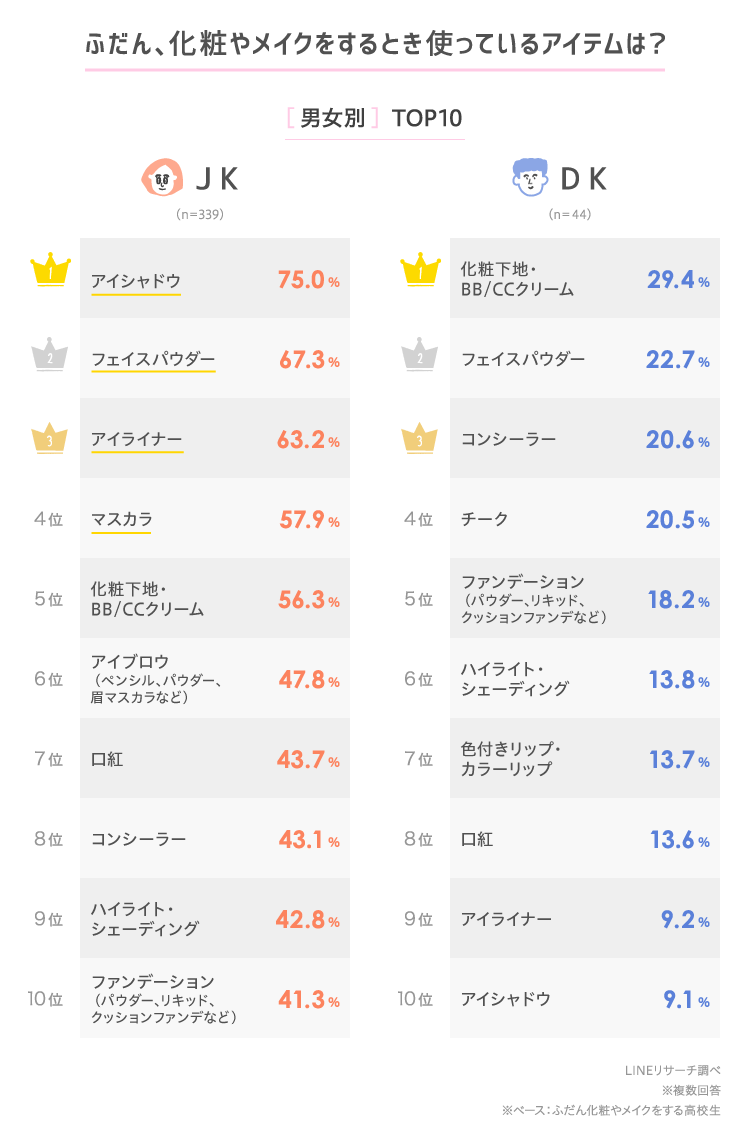 高2・高3女子では、アイメイク関連のアイテムのほかにも「ハイライト・シェーディング」「ファンデーション(パウダー、リキッド、クッションファンデなど)」の割合が高く、上位10位以内には入っていませんが、「リップティント」の割合も高くなりました。