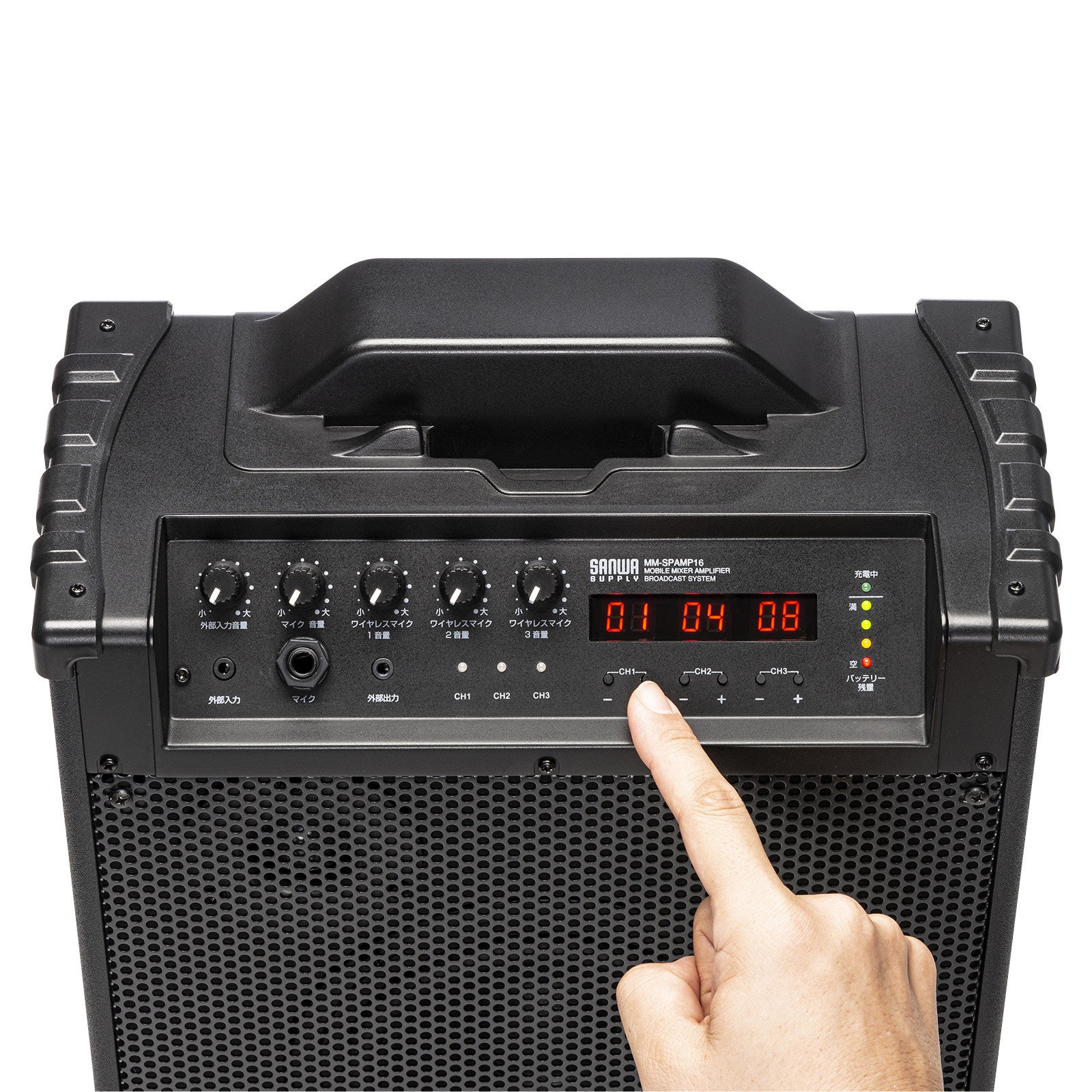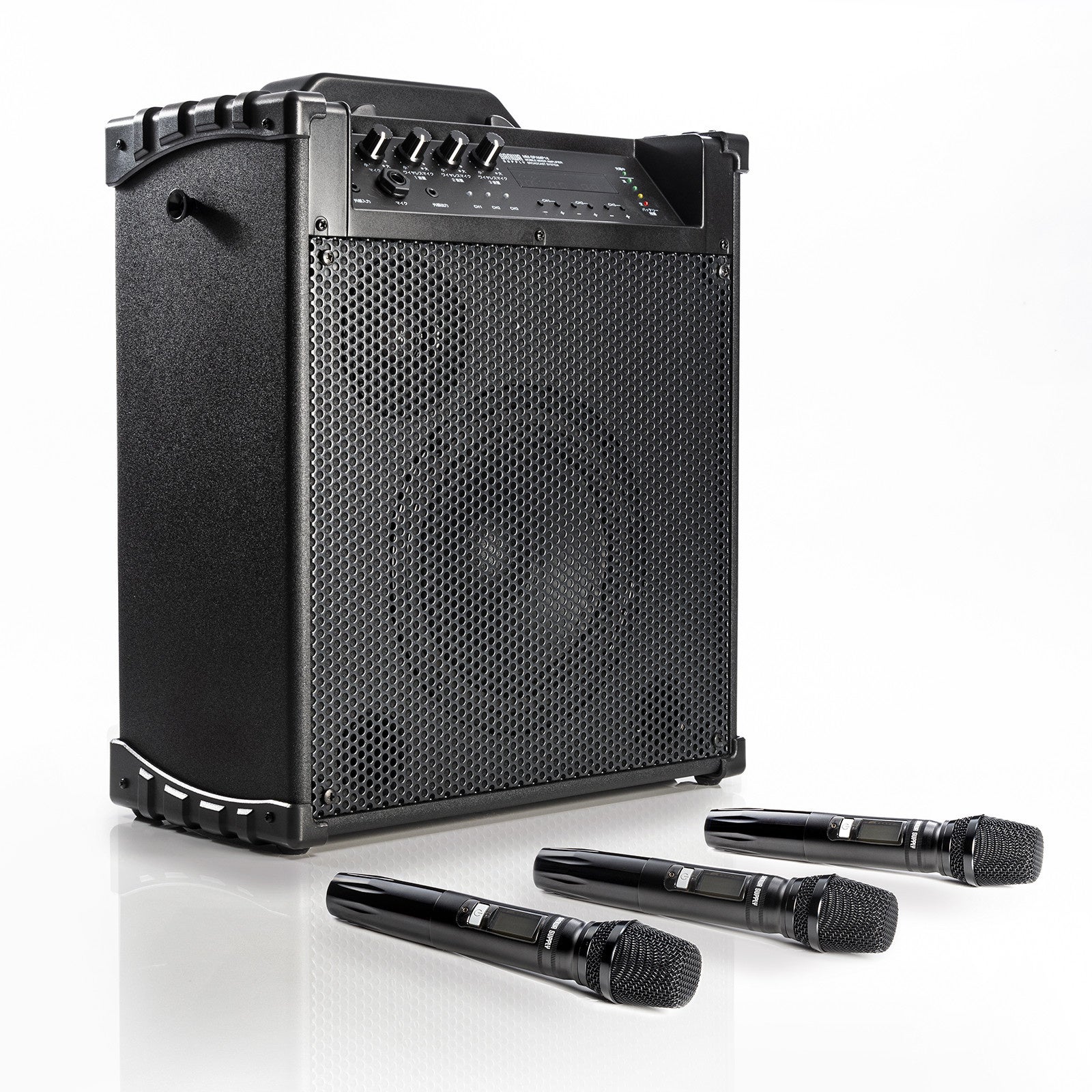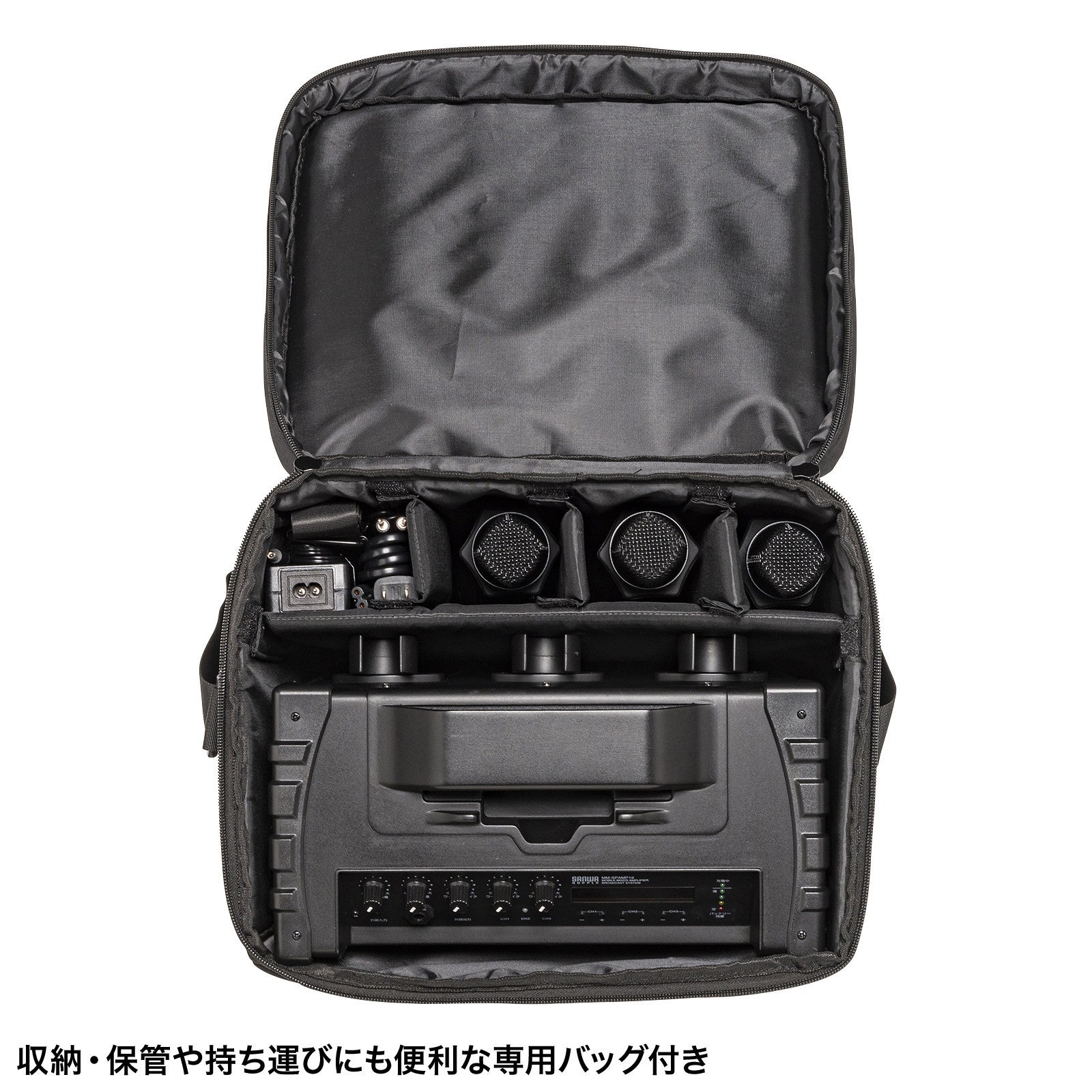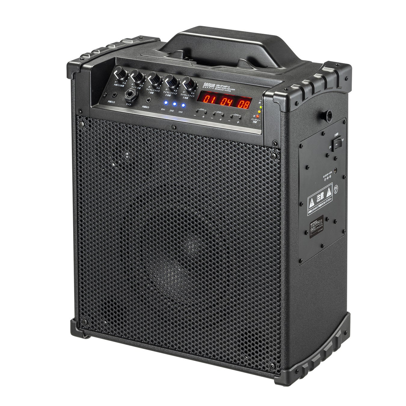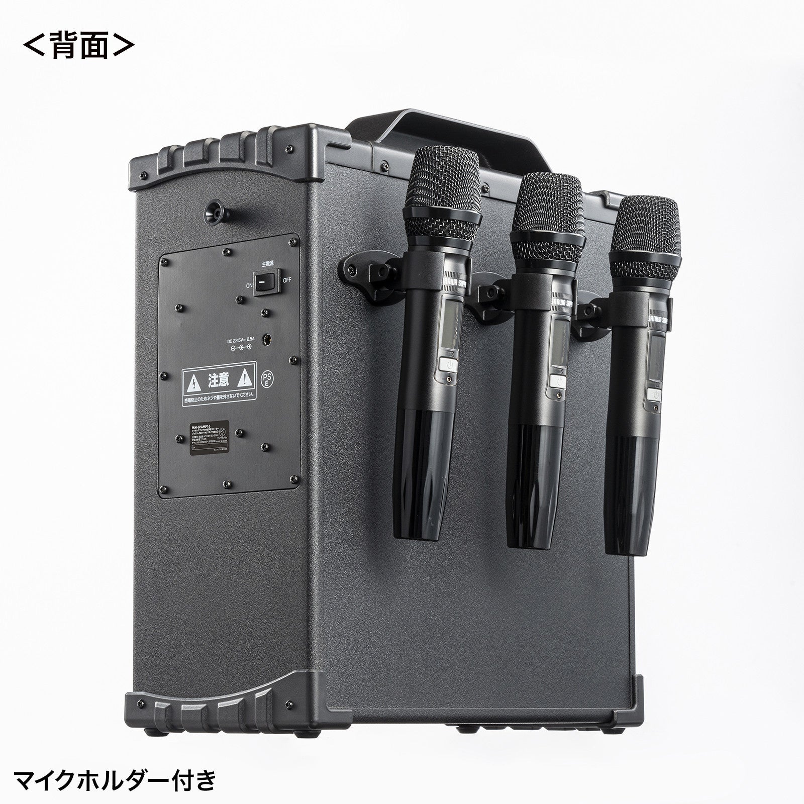 「MM-SPAMP16」は、3本のワイヤレスマイクを付属し、AC電源または内蔵バッテリーで動作する拡声器スピーカーです。