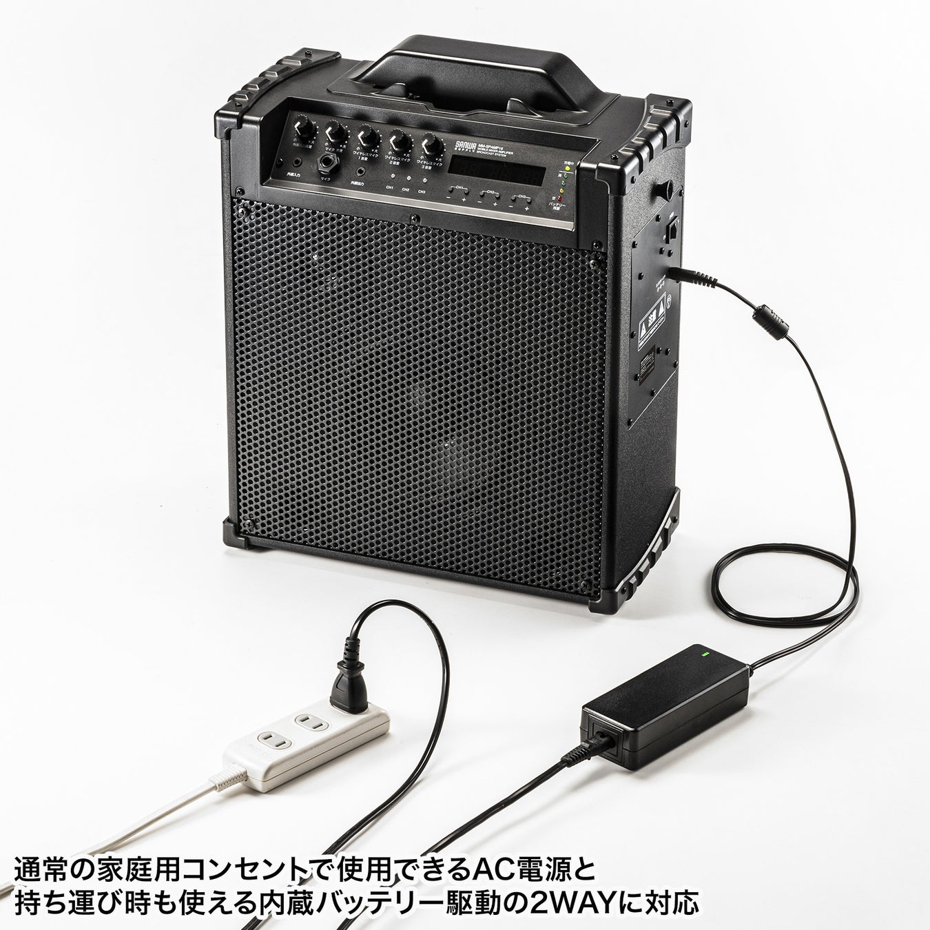 通常の家庭用コンセントで使用可能なAC電源と、電源のない場所でも使用できる内蔵バッテリー駆動の2WAYに対応しています。