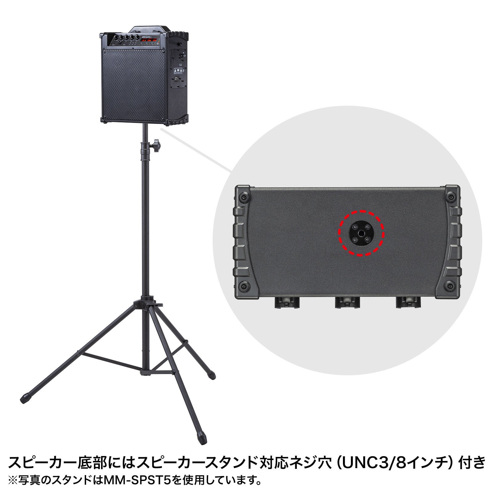 底面に、カメラ用三脚やスピーカースタンドが取り付けられるネジ穴(UNC3/8インチ)を搭載しています。