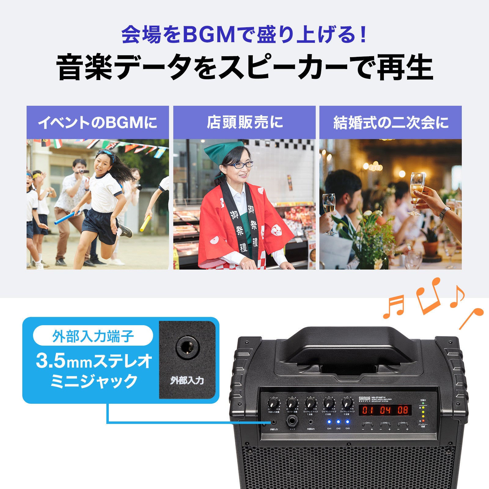 タブレットやスマートフォンからの音楽と音声を同時にスピーカーから出力できるマイクミキシング機能を搭載しており、カラオケ大会や結婚式の2次会などで音楽と共に音声を流すことができます。また、録音機器とつないで音声の録音も可能です。