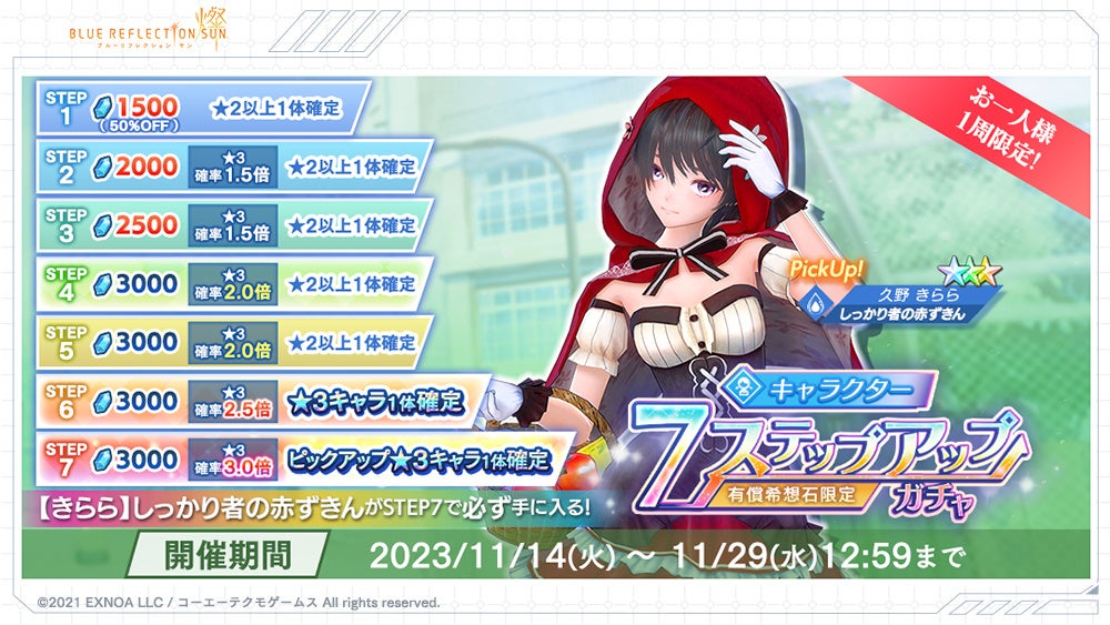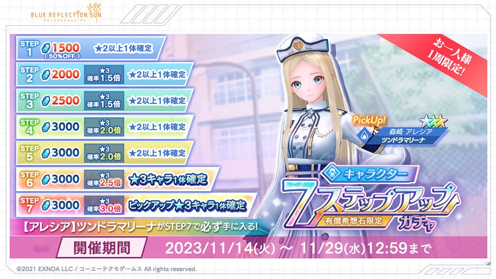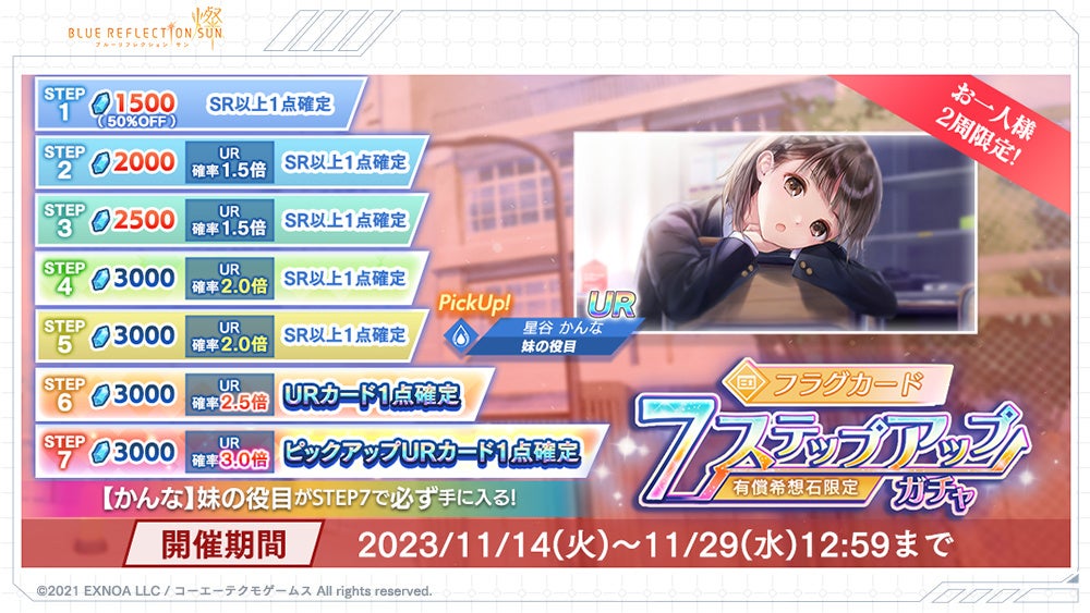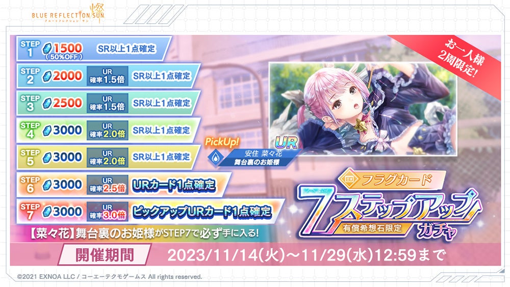 有償希想石で10連ガチャを引くごとにSTEPが1つアップ!STEP7では、それぞれのガチャで★3キャラクター/URフラグカードの出現確率が3倍になるほか、ピックアップ★3キャラクター1体/URフラグカード1枚が確定でゲットできます!