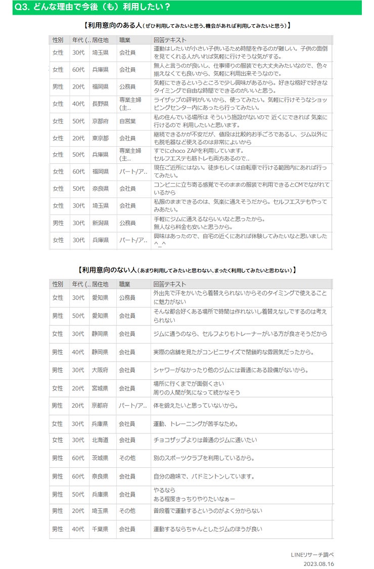 「chocoZAP」について利用意向のある人、利用意向のない人とそれぞれその理由を自由回答形式で聞きました。