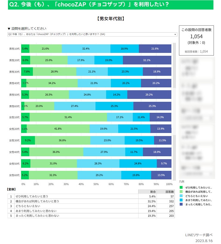 【LINEリサーチ】「chocoZAP(チョコザップ)」の認知は全体で8割、女性の方が利用意向が高い傾向
