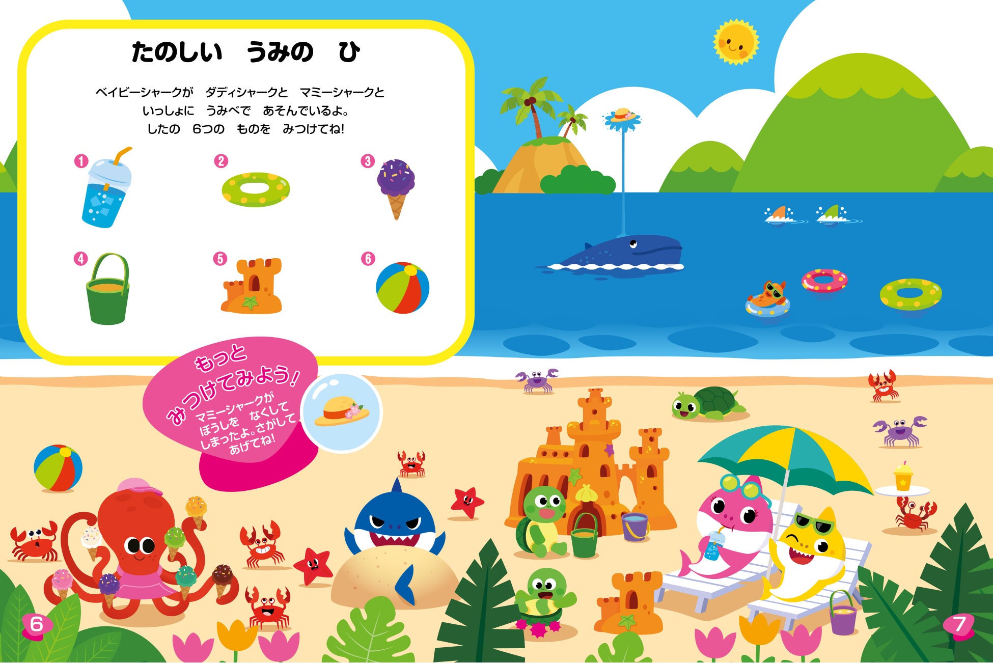 海の中でさがしあそびを楽しもう!YouTubeで大人気の動画「ベイビーシャーク・ダンス」(https://youtu.be/XqZsoesa55w)のキャラクター、ベイビーシャークのさがしあそび絵本が登場! 海の中で家族や仲間たちと楽しく暮らすベイビーシャークのかわいいシーンが満載! ビーチ、演奏会、海賊ごっこ、学校など、全13シーンの中から、食べ物や楽器、生き物、文房具などさまざまなものをさがして遊べます。さらに、絵本全体の中からさがす「むずかしいもんだい」も掲載。お子さまが楽しみながら、集中力を高められるさがしあそび絵本です。