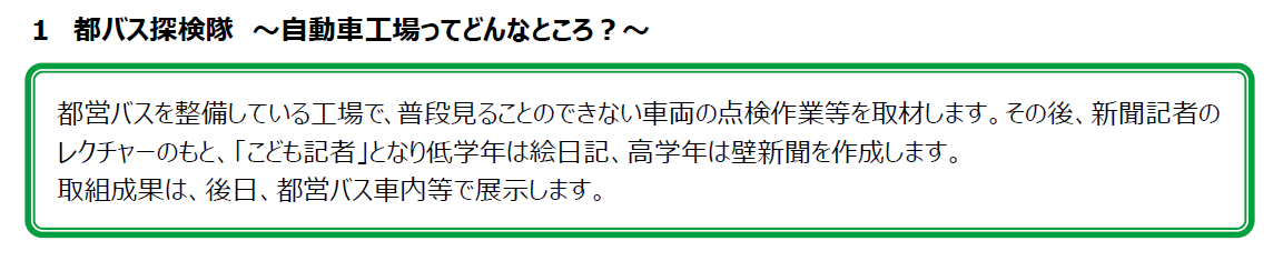 都バス探検隊では、小学生が「こども記者」となり、都営バスを整備している工場で、普段見ることができない点検作業等を取材し、 その後、新聞記者と一緒に絵日記や壁新聞を作成します。