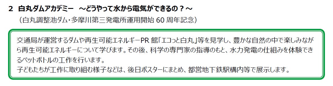 白丸ダムアカデミーでは、奥多摩の豊かな自然の中で再生可能エネルギーについて学べる企画や、科学の専門家の指導のもとで、ペットボトルを使って水力発電の仕組みを体験するワークショップを実施します。