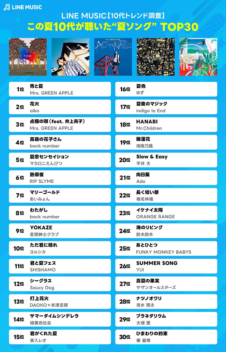 <LINE MUSIC 10代トレンド調査>この夏10代が聞いた夏ソングTOP30を発表!1位Mrs. GREEN APPLE「青と夏」、2位aiko「花火」
