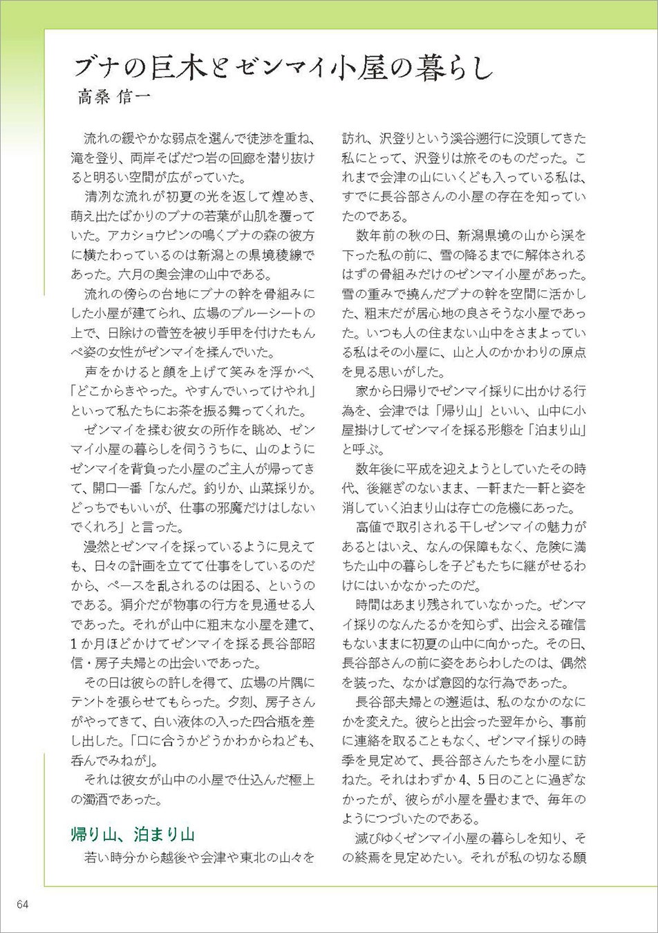 山岳ガイドの高桑信一氏ほか、山や木に係わる人々について取り扱ったコラムを10本以上収録。神木巡りが趣味の女性座談会や土地の歴史に関わるコラムなど、テーマも豊富。