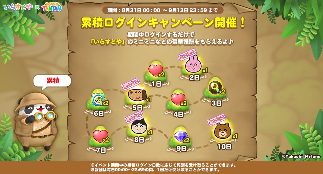 イベント期間中にログインすると、「ダイヤ」などのゲーム内アイテムをプレゼントします。10日目以外にも『いらすとや』コラボ限定のミニミニがもらえます。