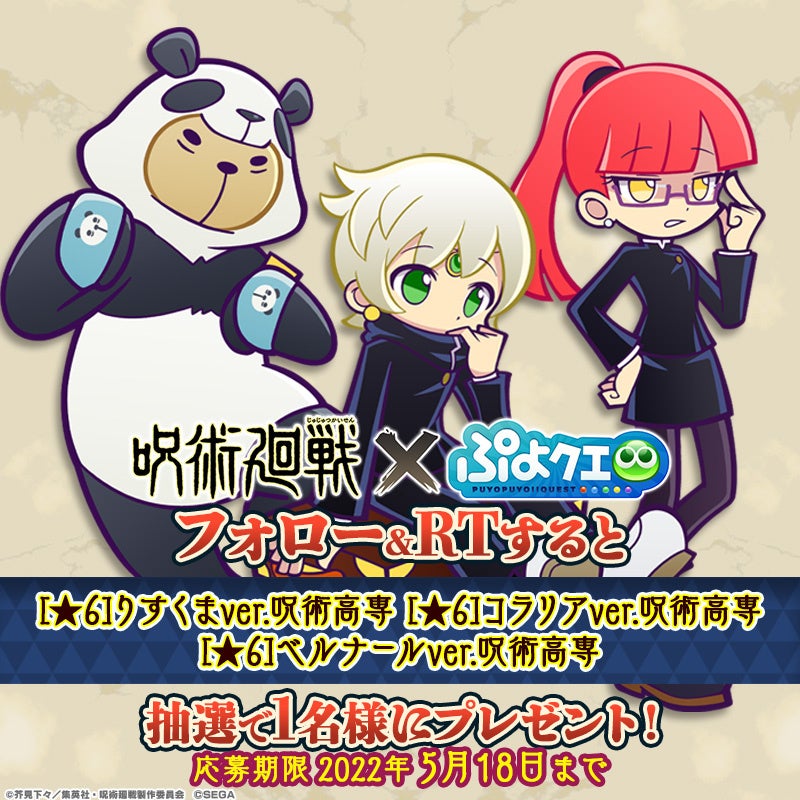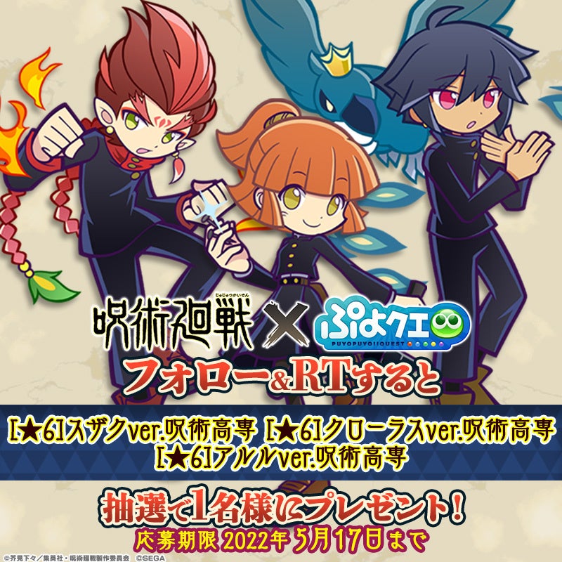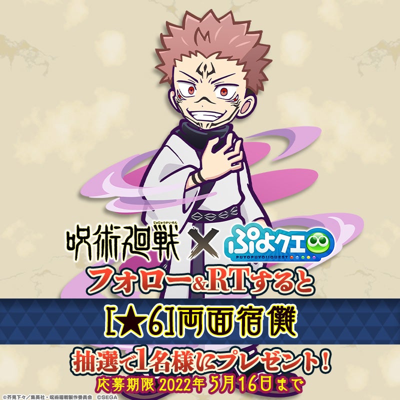 株式会社セガは、大好評配信中のパズルRPG『ぷよぷよ!!クエスト(以下、『ぷよクエ』)』にてTVアニメ『呪術廻戦』とのコラボレーションイベントを2022年5月20日(金)から6月9日(木)まで開催することをお知らせします。