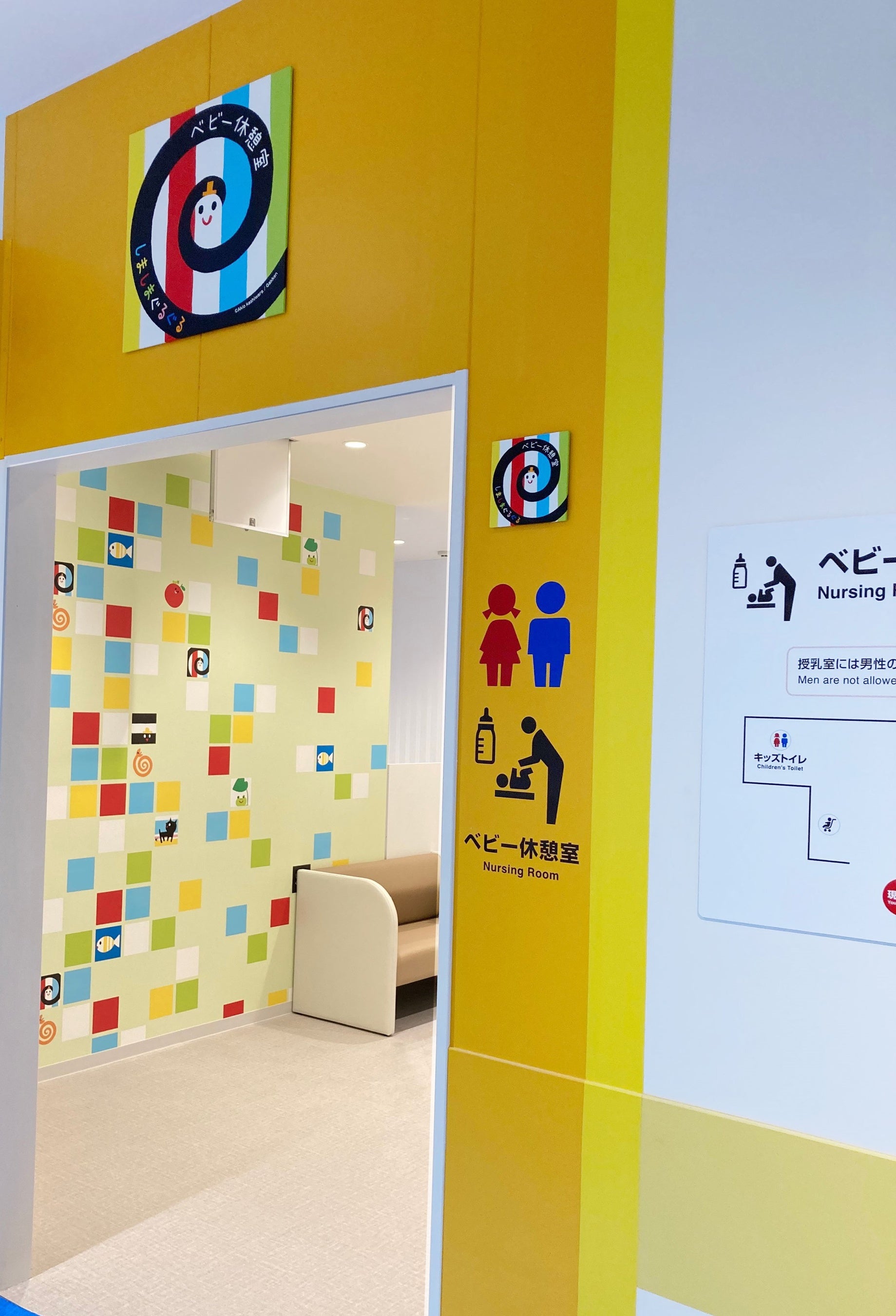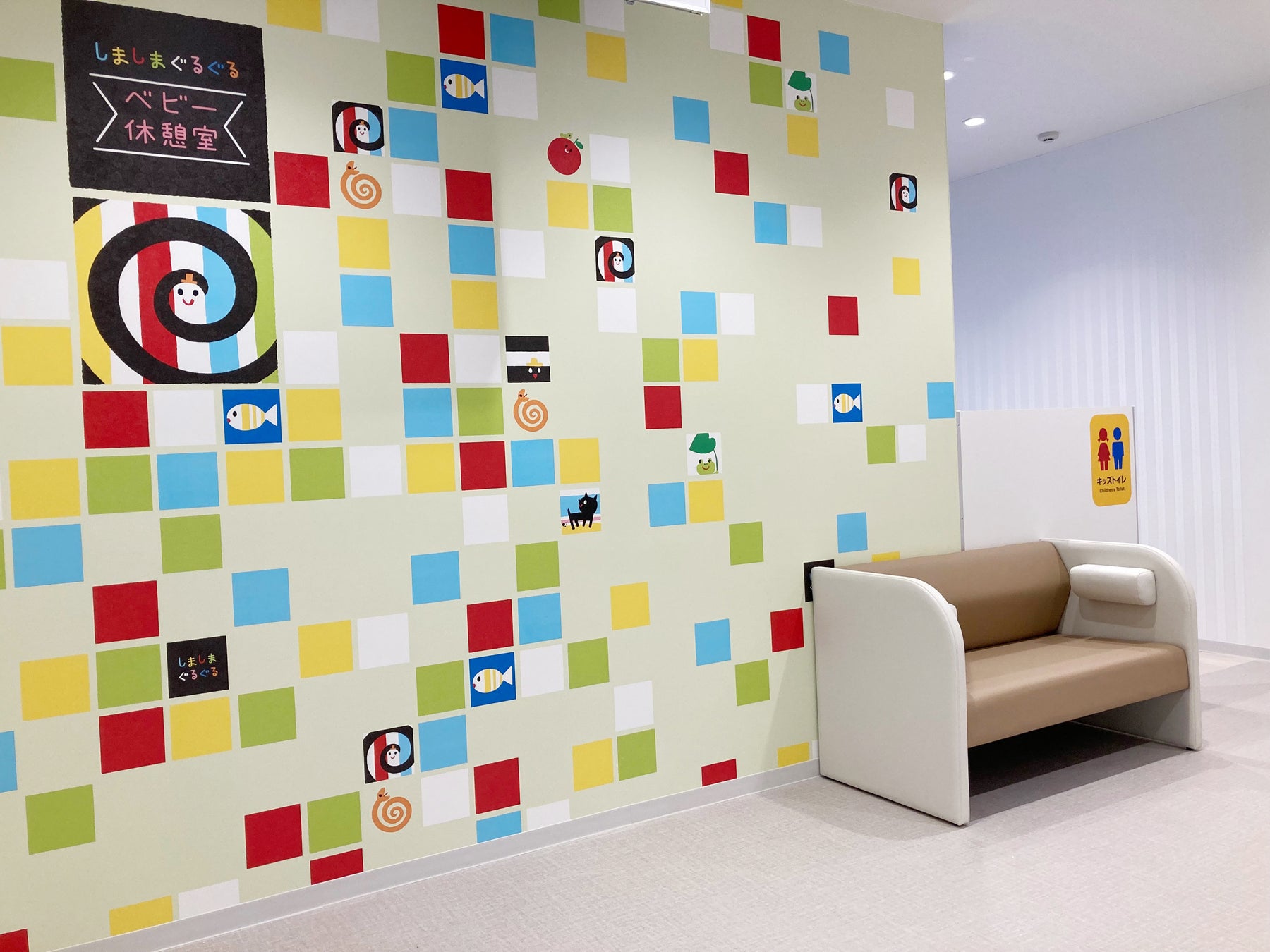 1階と2階のベビー休憩室には、『しましまぐるぐる』とコラボレーションしたデザインウォールを用意。カラフルな色づかいでお子さまにも喜んでいただける空間です。