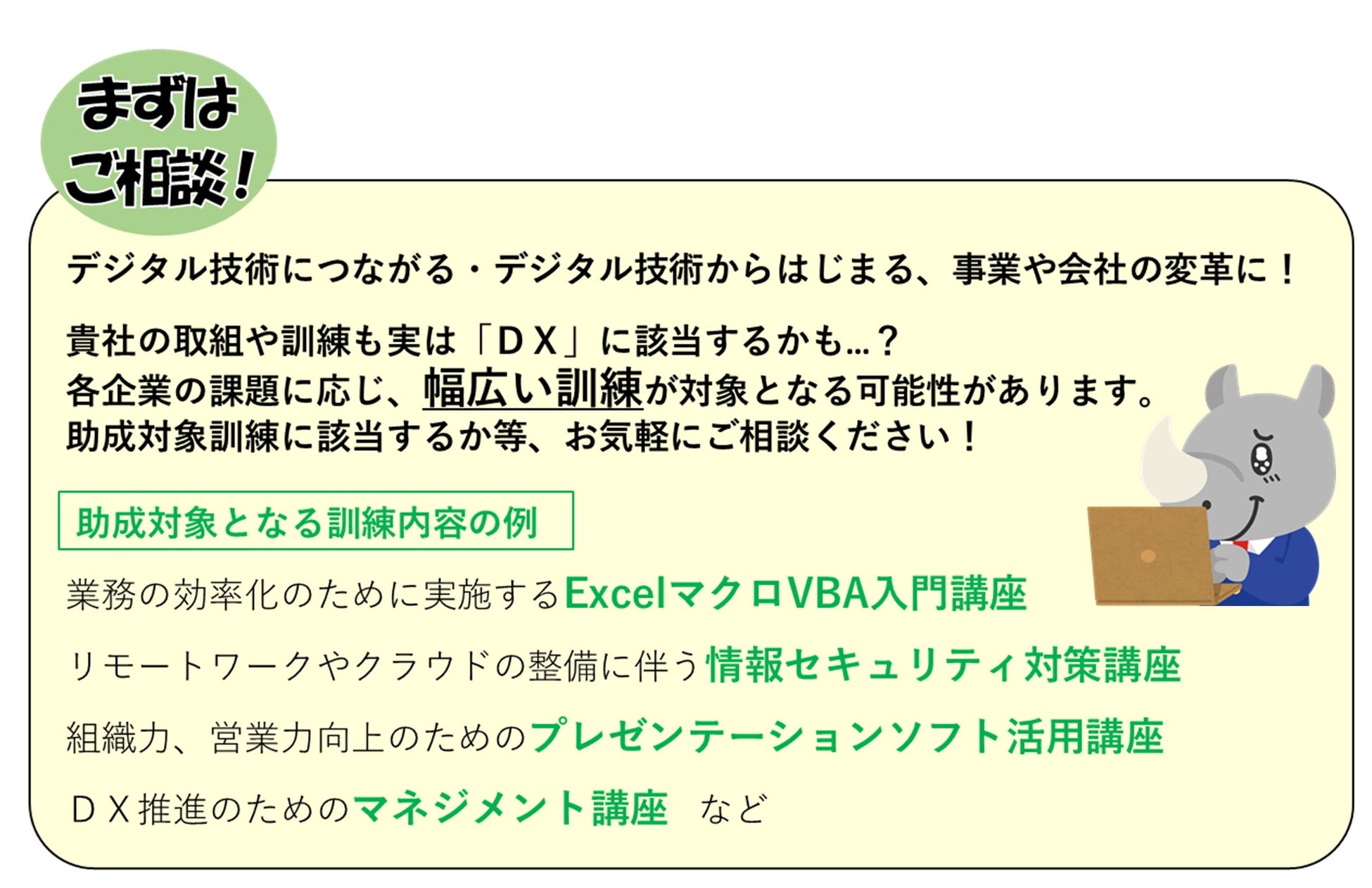 都内中小企業等が従業員に対して、民間の教育機関等が提供するデジタルトランスフォーメーション(DX)に関する職業訓練(専門的な知識・技能の習得と向上、又は資格を取得するための訓練)において、集合又はeラーニング等を利用した際に係る経費を助成します。