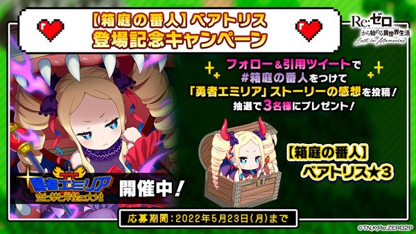 内容:『リゼロス』公式Twitter (https://twitter.com/re_zero_rezelos)をフォローして、キャンペーンツイートを引用&ハッシュタグ「#箱庭の番人」をつけて、勇者エミリア」ストーリーの感想を投稿すると、「【箱庭の番人】ベアトリス★3」を抽選で3名様にプレゼントするキャンペーンを開催します。