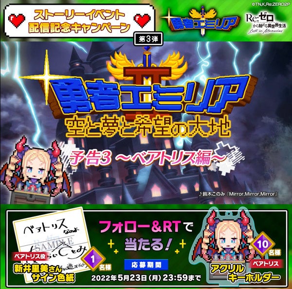 内容:『リゼロス』公式Twitter (https://twitter.com/re_zero_rezelos)をフォロー&対象のツイートをRTすると、抽選で「ベアトリス役・新井里美さんのサイン色紙」を1名様、「ベアトリス アクリルキーホルダー」を10名様にプレゼントするキャンペーンを開催します。