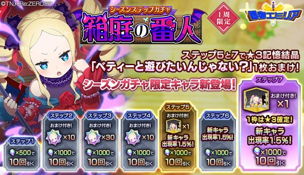 内容:ストーリーイベント「勇者エミリア」の特効を持ったキャラクター「【箱庭の番人】ベアトリス★3」、記憶結晶「ベティーと遊びたいんじゃない?★3」の出現率がUPする「シーズンガチャ【箱庭の番人】」を開催します。