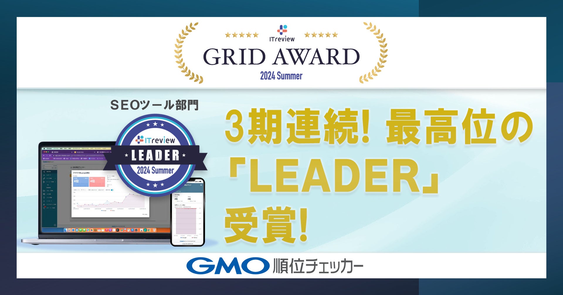 「GMO順位チェッカー」ITreview Grid Award 2024 SummerのSEOツール部門で最高賞「Leader」3期連続受賞【GMOソリューションパートナー】