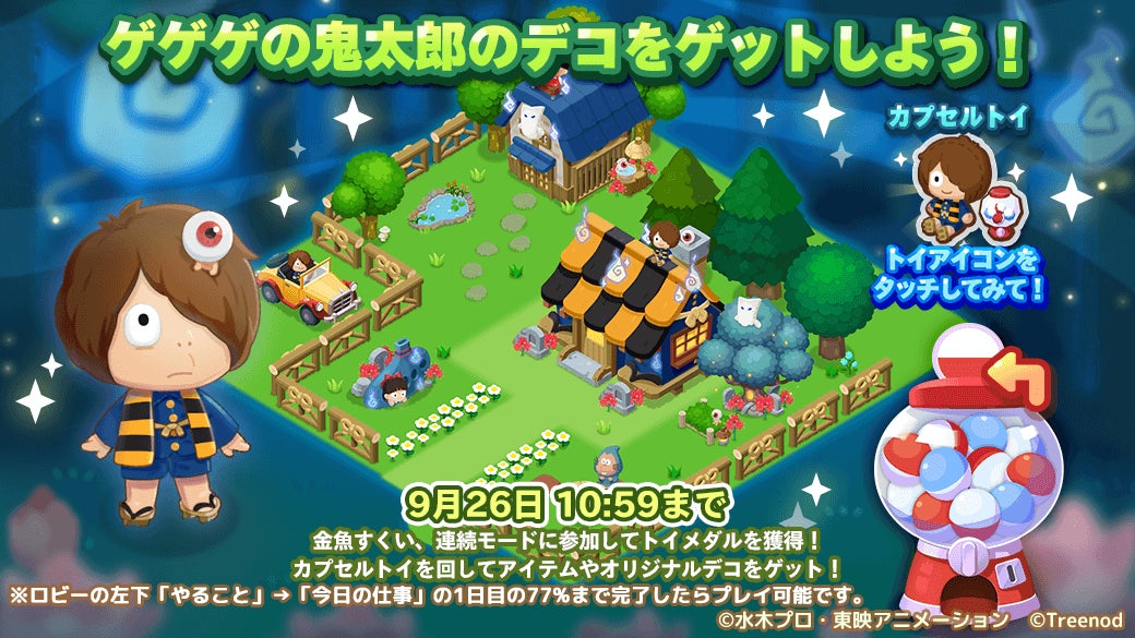LINE株式会社は、当社が展開する町づくり×1タップパズルゲーム「LINE ポコパンタウン」(iPhone・Android対応/無料)において、アニメ『ゲゲゲの鬼太郎(第3期)』とのコラボレーションを開始しました。