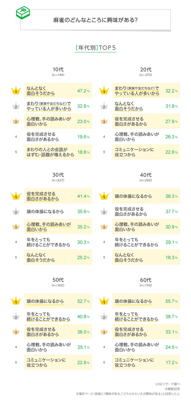 ■⿇雀に興味がある⼈の理由は年代で異なる傾向に