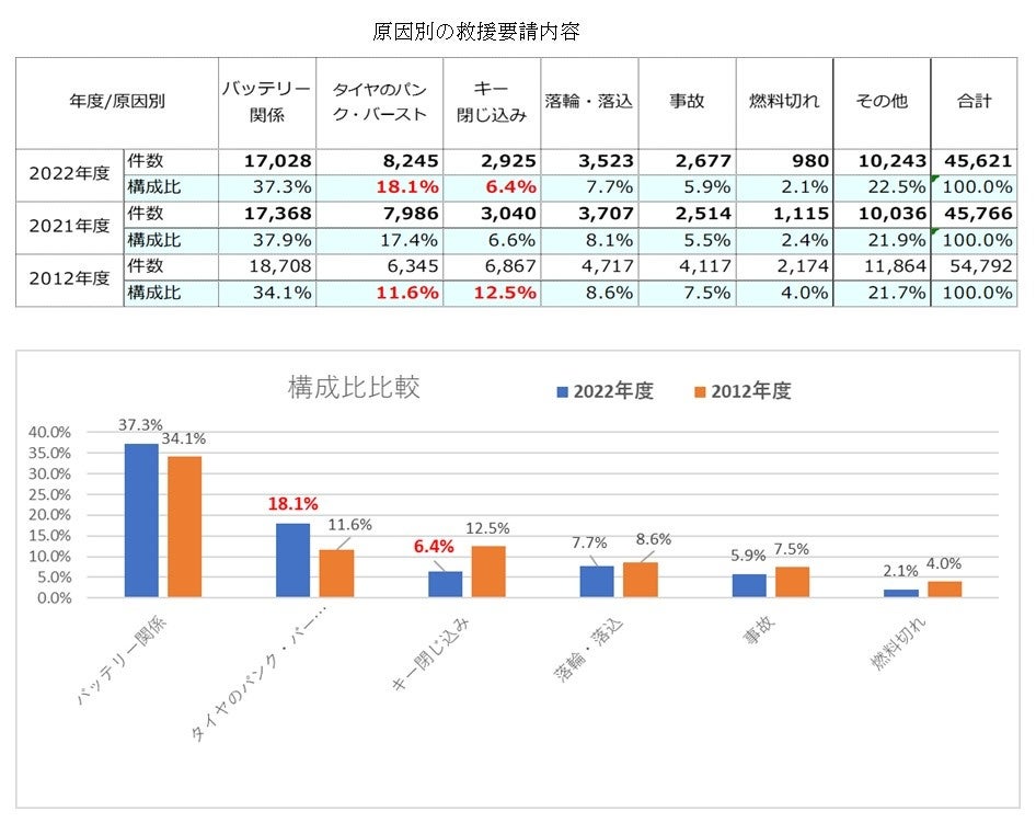 また、救援要請の原因別では、昨年と比較し大きな変化はありませんが、10年前の2012年度と比較すると、タイヤのパンク・バーストに関しては1,900件増加し構成比も6.5ポイント増加しました。一方、キー閉じ込みは4,402件減少し構成比も6.1ポイント減となりました。タイヤのトラブルが増加した要因としてはスペアタイヤ未搭載車両が増え、ドライバー自身が現場でのタイヤ交換ができなくなったことやセルフ式のガソリンスタンドが増えタイヤの点検をする機会が減少したことが考えられます。