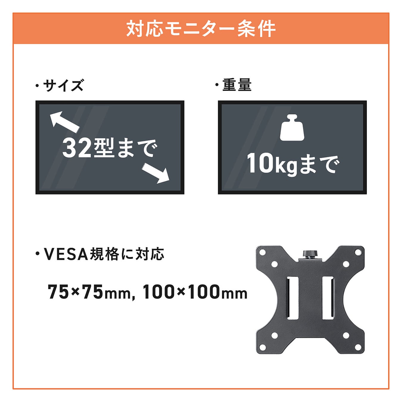 耐荷重は10kgまでで32インチ程度までのテレビ/モニターを設置可能で、VESA規格(75×75mm、100×100mm)に準拠した液晶ディスプレイの取り付けが可能です。