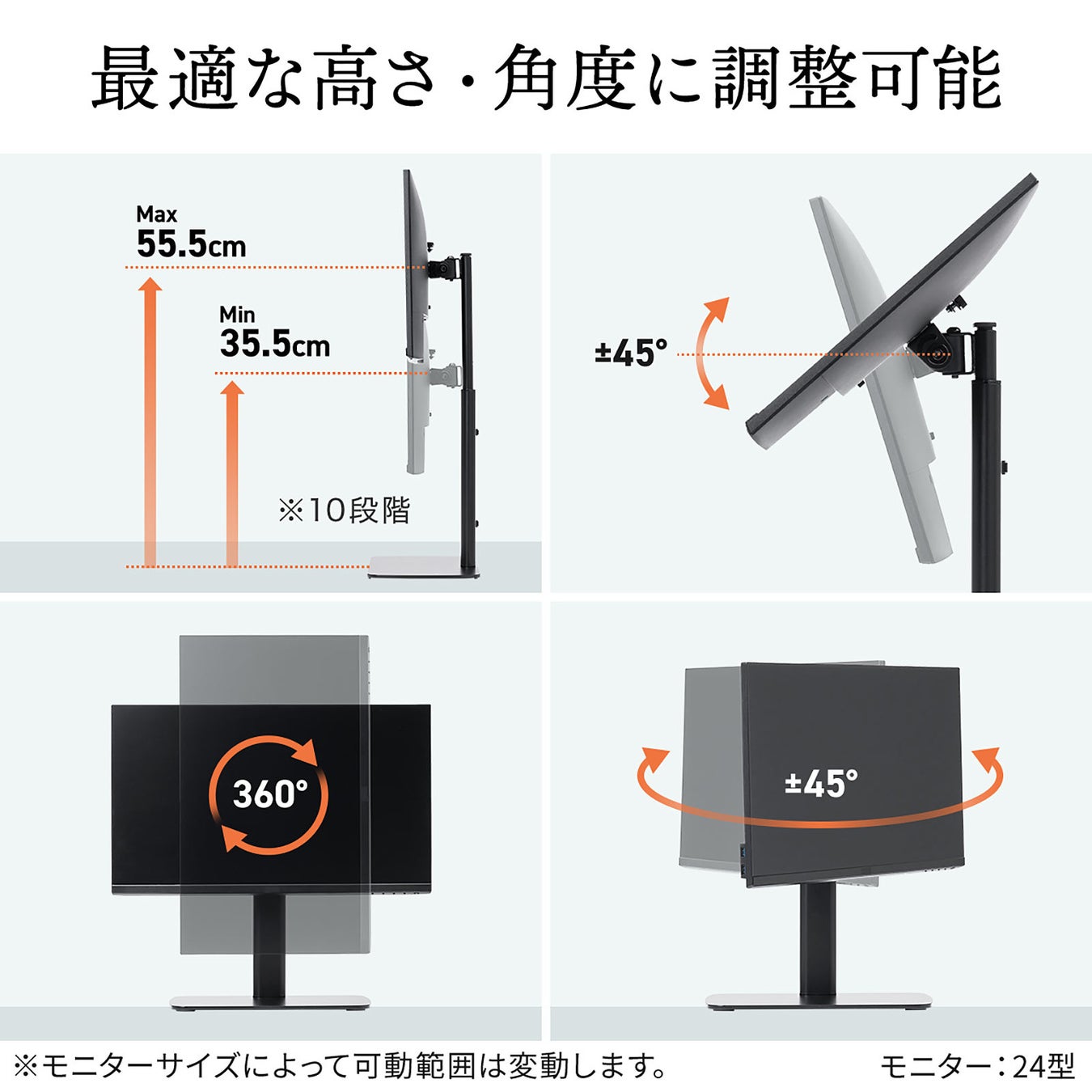 モニター高さは35.5~55.5cmまで10段階で調整できます。また、画面の向きを上下に±45度、左右に±45度調節が可能です。そして、ディスプレイも360度回転させることができます。