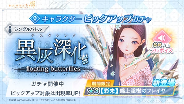 合同会社EXNOA(本社:東京都港区、CEO:村中 悠介、URL:https://games.dmm.com)が運営するDMM GAMESは、スマートフォン/PC向けヒロイックRPG『BLUE REFLECTION SUN/燦』にて、新イベント「異灰深化 -floating butterflies-」を開催したことをお知らせいたします。