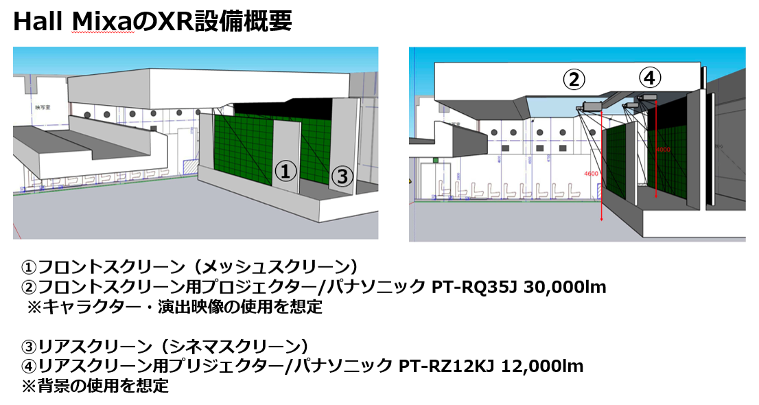 館内自社運営ホールのHall MixaとTheater Mixaに、常設設備としてフロントの透過(メッシュ)スクリーンとリアのシネマスクリーン、それぞれキャラクターや演出映像、背景映像などを投射するプロジェクターを用意。これによりXRライブ演出等が可能となっています。フロントの透過(メッシュ)スクリーンは収納可能でXRライブ以外のリアルな演目、イベントにもご利用いただける仕様となっています。