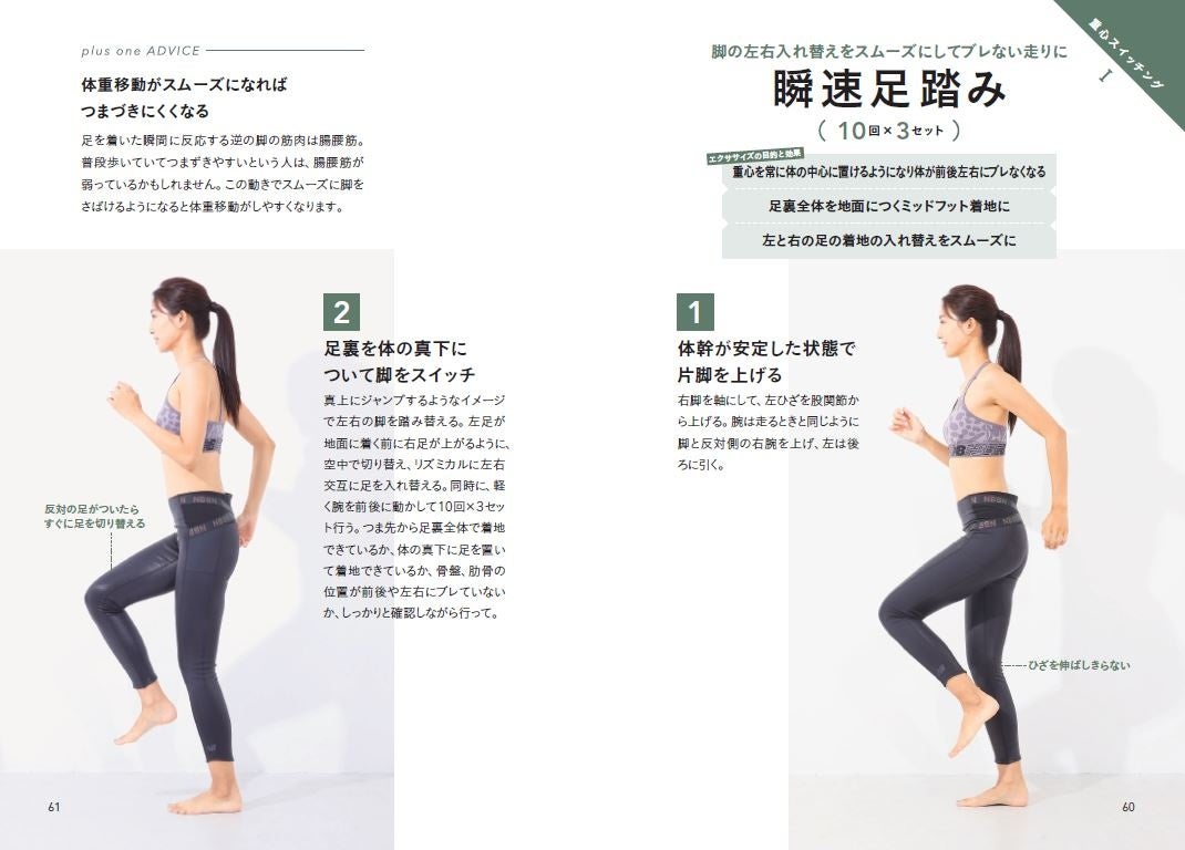 コツの2つ目。STEP2では、走る基本姿勢や着地の仕方など、美脚になる走り方の基本を「重心移動」をキーワードに紹介。その基本姿勢や着地が身につくトレーニングは、まさかの、室内で「踏み台昇降」や「壁押しもも上げ」をするだけ。
