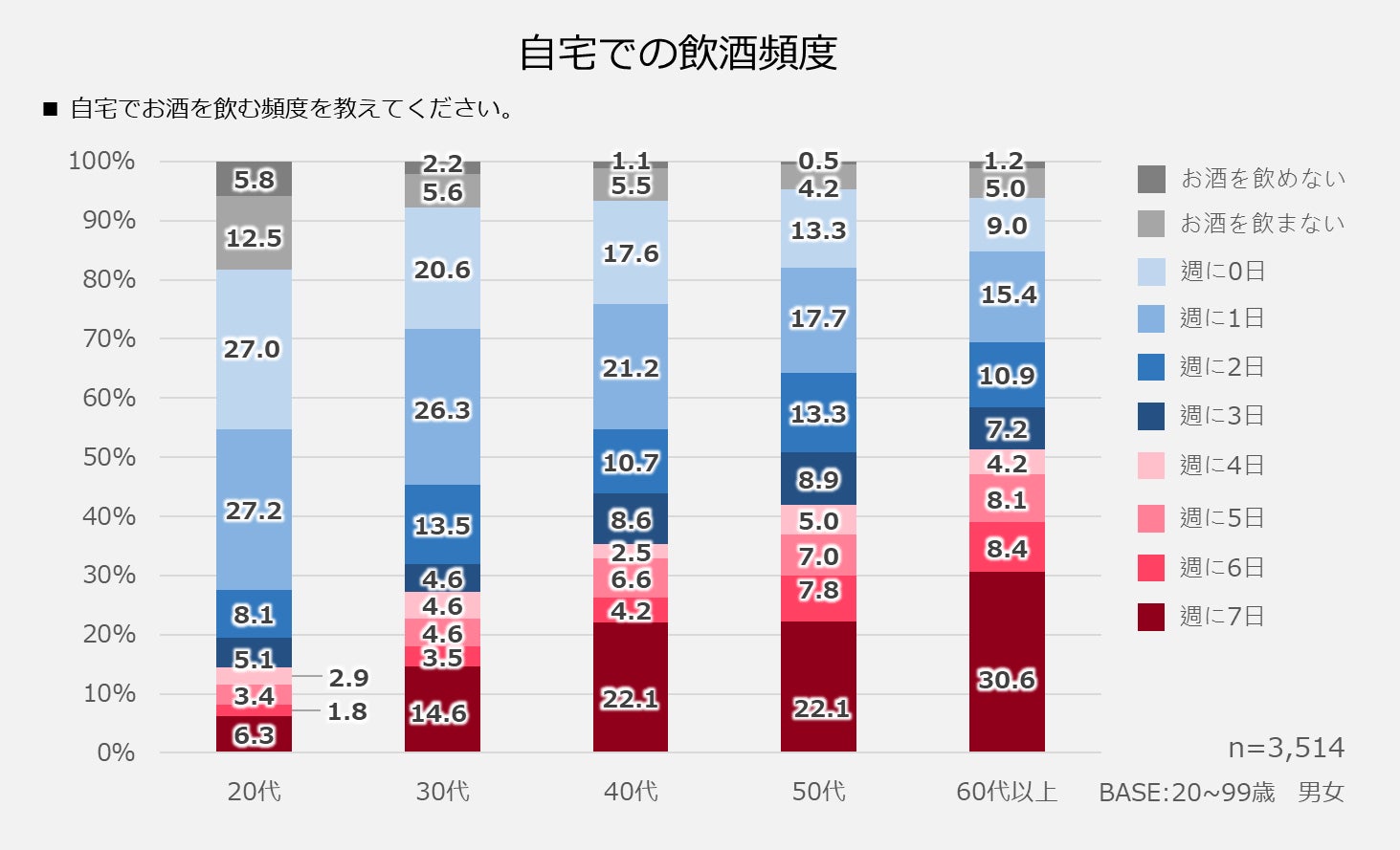 60代以上では週7日自宅飲酒する人が30.6%に達する一方、20代では6.3%にとどまり、世代間の大きな隔たりが見られました。
