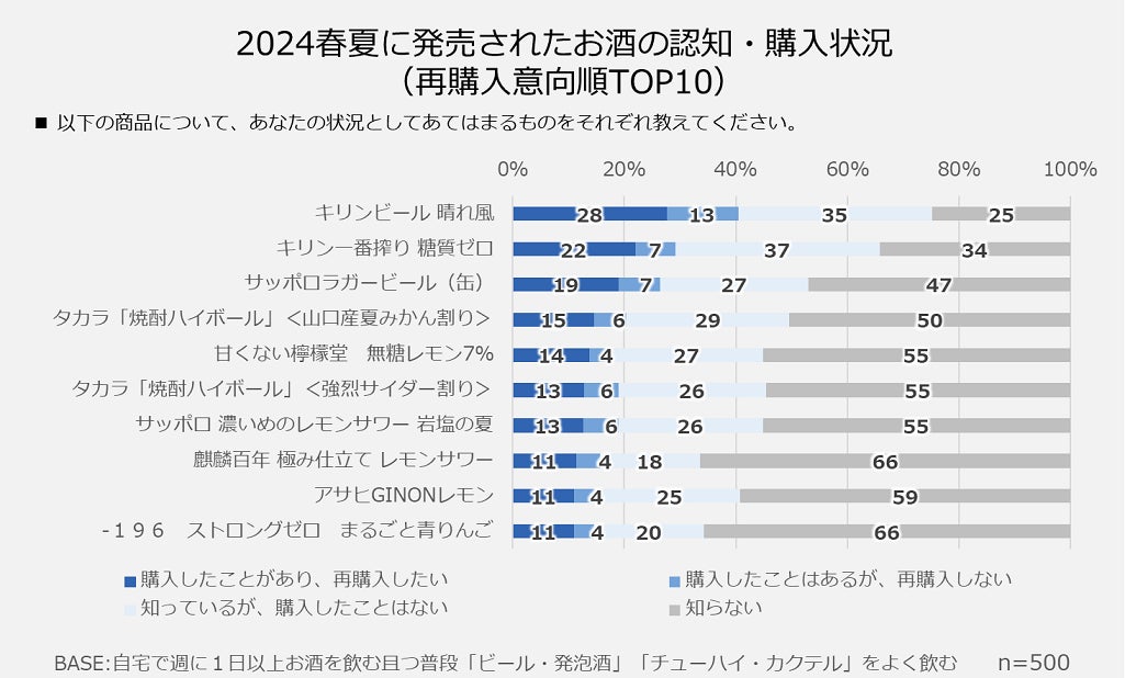 ■2024春夏に発売された「ビール・発泡酒」「チューハイ・カクテル」の認知・購入状況(再購入意向順TOP10)