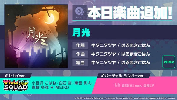 株式会社セガ(本社:東京都品川区、代表取締役社長COO:杉野行雄)と株式会社Colorful Palette(本社:東京都渋谷区、代表取締役社長:近藤裕一郎)は、iOS/Android向けリズム&アドベンチャー『プロジェクトセカイ カラフルステージ! feat. 初音ミク(以下、プロジェクトセカイ)』について、2022年5月20日(金)よりキタニタツヤさん、はるまきごはんさんの書き下ろし楽曲「月光」をゲーム内に追加いたしました。