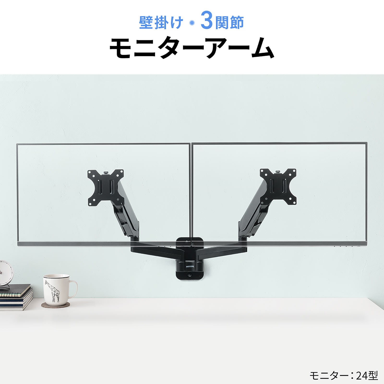 本製品は、壁面にモニターを設定できるデュアルモニターアームです。
