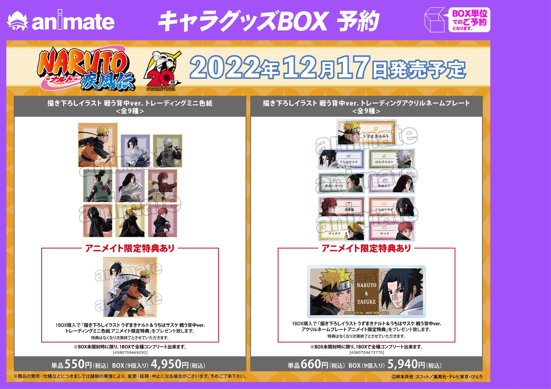 1BOX購入で「描き下ろしイラスト うずまきナルト&うちはサスケ 戦う背中ver. アクリルネームプレート アニメイト限定特典」をプレゼントいたします。特典はなくなり次第終了とさせていただきます。