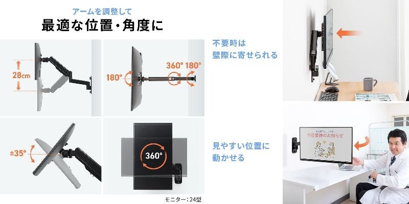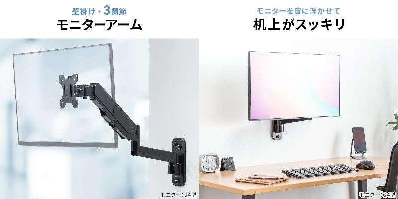 ガス圧の軽い力で角度・高さを調整できる!3関節対応の壁掛けモニターアームを12月27日発売