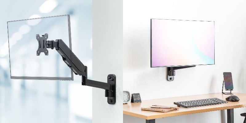本製品は、壁面にモニターを設定できるモニターアームです。壁にモニターを取付けることで足元やデスクスペースを有効に使えます。