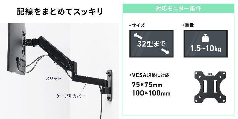 モニターアーム 壁設置 ガス圧式 32インチ対応 上下 左右調整 3関節 ブラック