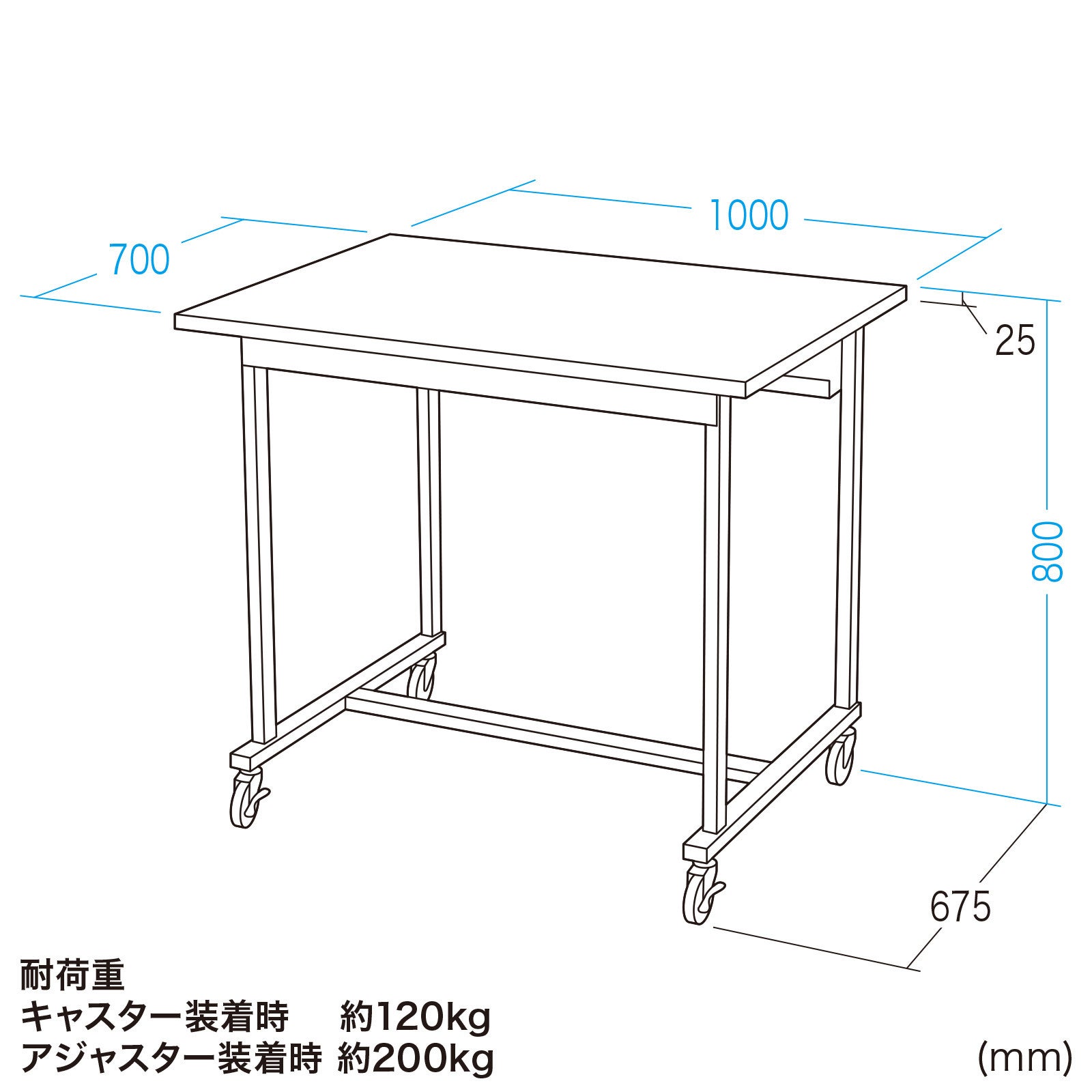 耐荷重はキャスター装着時が約120kg、アジャスター装着時は約200kgです。