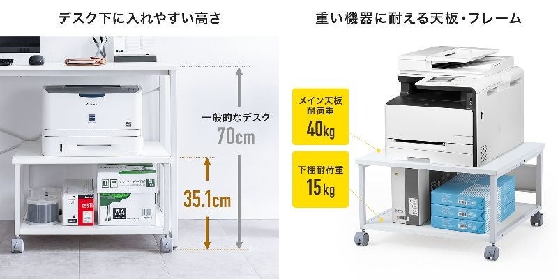 デスク下に収納できる高さ約35cmのコンパクトサイズです。フレームは丈夫なスチール製で、天板は耐摩耗性、耐水性に優れたメラミン化粧板仕様です。耐荷重は天板が40kg、底板が15kgの総耐荷重55kgで、しっかり安定して使用できます。