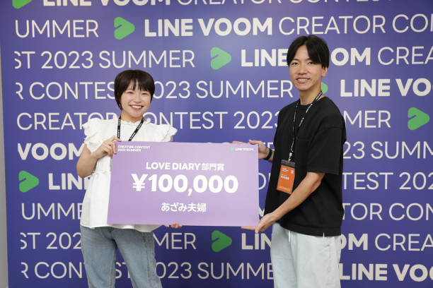 受賞者からのコメント「この度は表彰いただきありがとうございました。夫婦のたわいもない時間がLINEVOOMを通じて皆さんを笑わせられてると思うと嬉しくてたまりません!いつもは家に引きこもって活動しているので実感が湧かなかったのですが、人前で素敵な言葉をいただけてモチベーションが更に上がりました!これからも私たちらしく楽しくラブダイアリーを更新していこうと思います!」