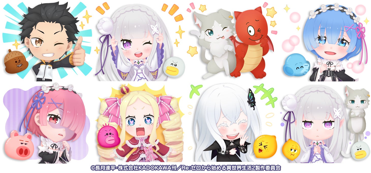「ナツキ・スバル」「エミリア&パック」「ラム」「レム」「エキドナ」「ベアトリス」登場のほか、『Re:ゼロから始める異世界生活』コラボ限定LINEスタンプ(全8種類)も無料配信