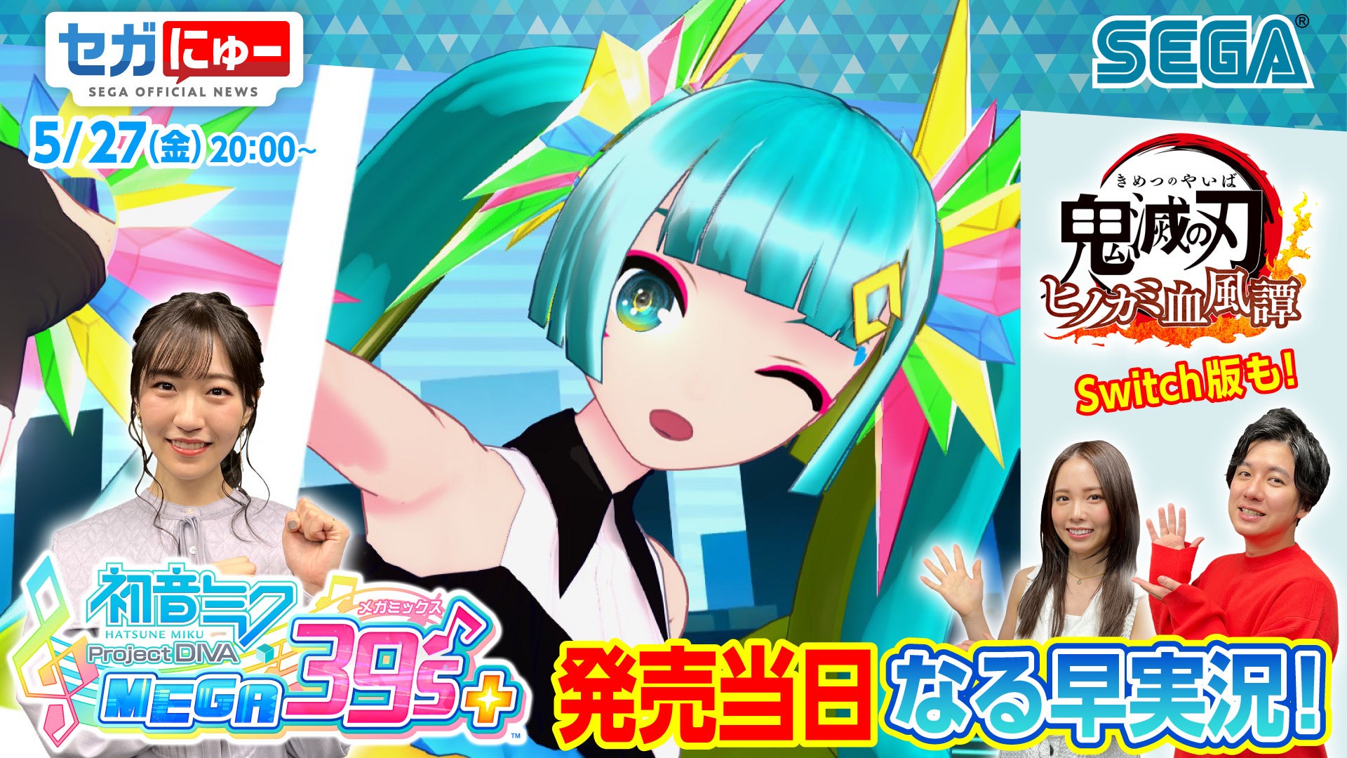 また、「セガキン」のコーナーでは、本日5月27日(金)より、PC(Steam)にて配信開始の『初音ミク Project DIVA MEGA39’s+』をプレイ! 全250曲(DLC含む)のリズムゲームから前島さんの推し曲や、タイトルの魅力について語っていただきます。