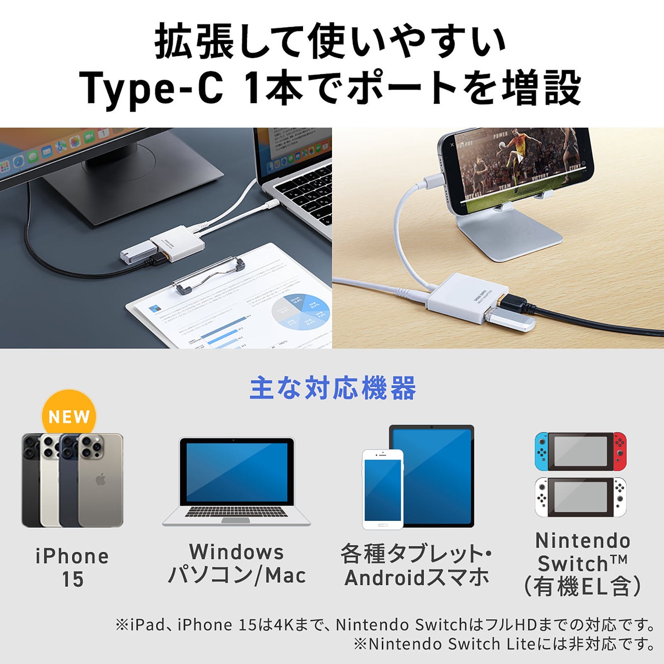 400-HUBCP21Wは、HDMIポートを搭載しHDMI出力4K/30Hz対応で、ソフトウェアのインストールなしで簡単にマルチディスプレイ環境(ミラーモード/拡張モード)を実現できます。