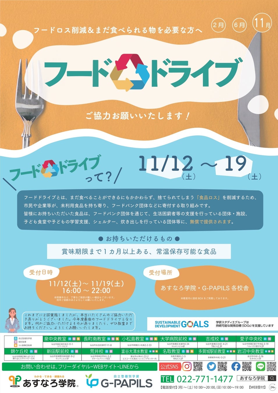 宮城県の総合進学塾あすなろ学院で第3回フードドライブ開催!