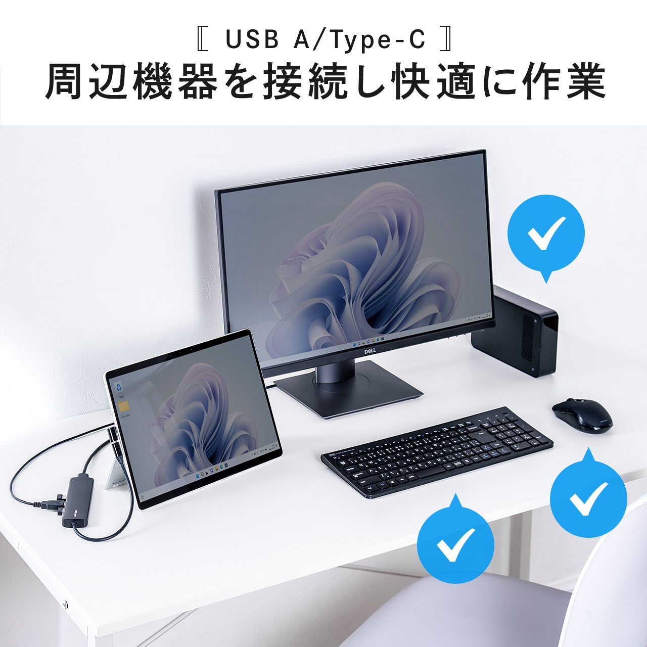 USB Type-Cコネクタ採用で、Type-Cポートを搭載したパソコンやスマホ・タブレット、ゲーム機などで使用できます。Type-CポートにはマウスやUSBメモリが接続可能です。