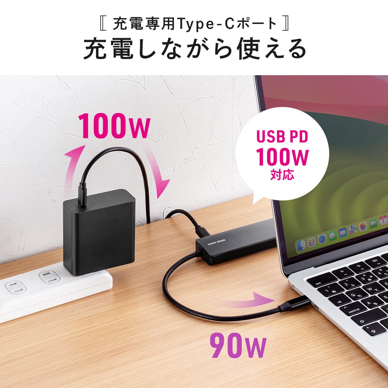 Type-CポートはPD対応のACアダプタを接続すれば周辺機器を使用しながらUSB PD(USB Power Delivery)対応のパソコンの充電ができ、最大100Wまでの充電に対応しています。