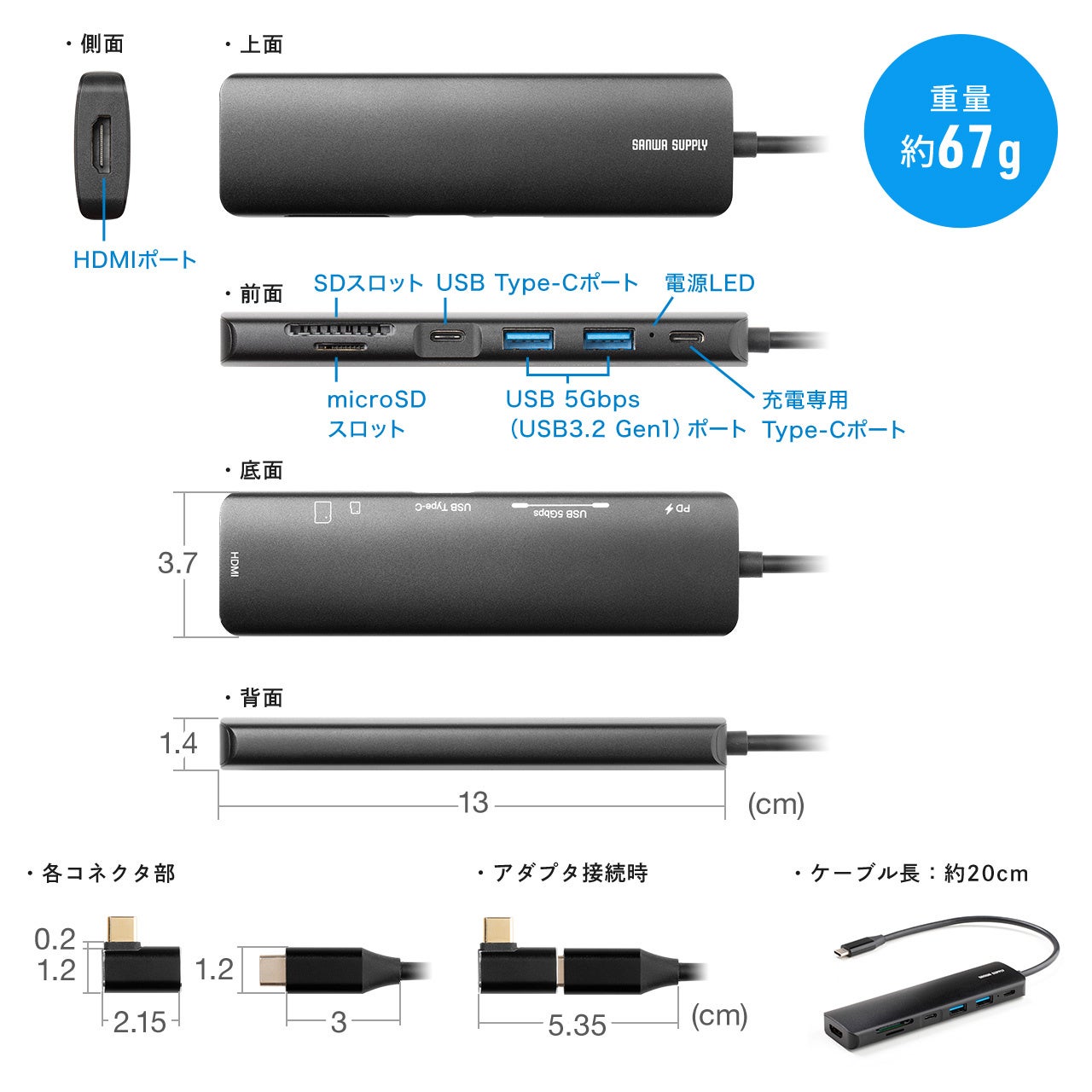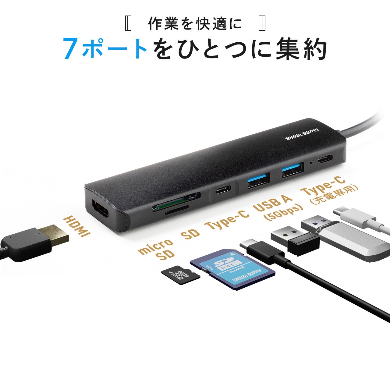 Type-Cケーブル1本でHDMI、USB A×2、Type-C×1、PD充電器(最大100W)、SDカード×1、microSDカード×1の拡張接続ができます。
