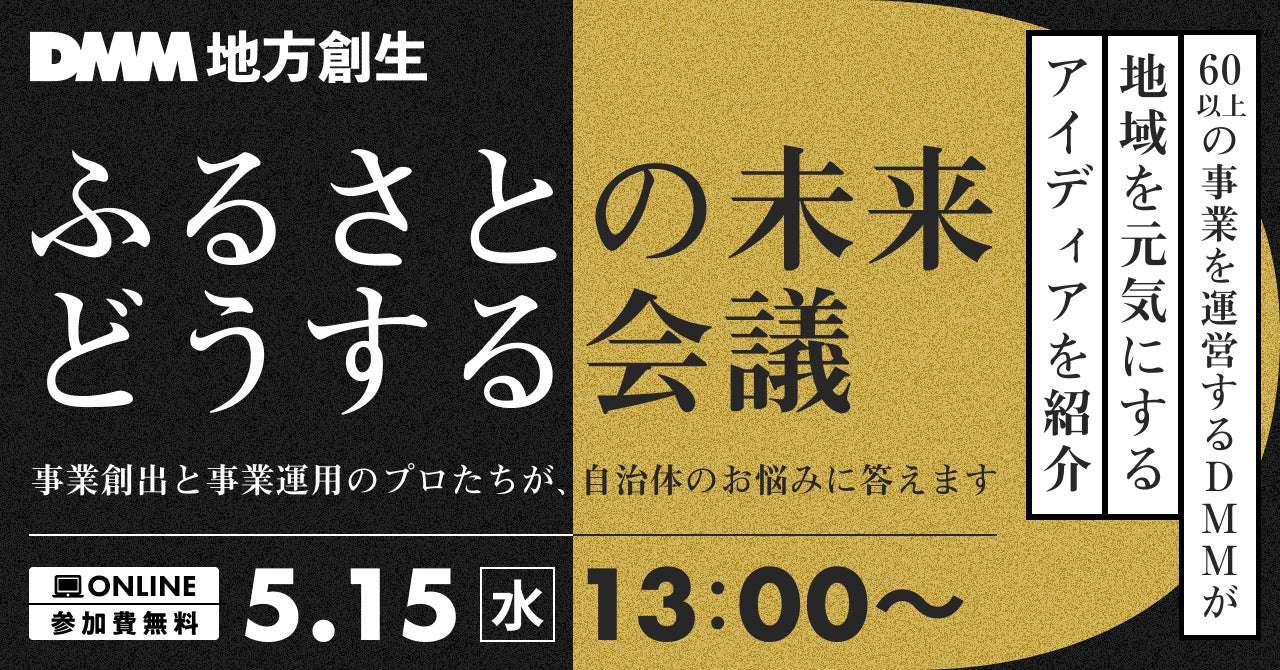 合同会社DMM.com(本社:東京都港区、会長 兼 CEO 亀山敬司、以下 DMM)は、地方創生事業(DMM 地方創生)において、「ふるさとの未来どうする会議 by DMM 地方創生〜事業創出と事業運用のプロたちが、自治体のお悩みに答えます〜」を2024年5月15日(水)に開催いたします。