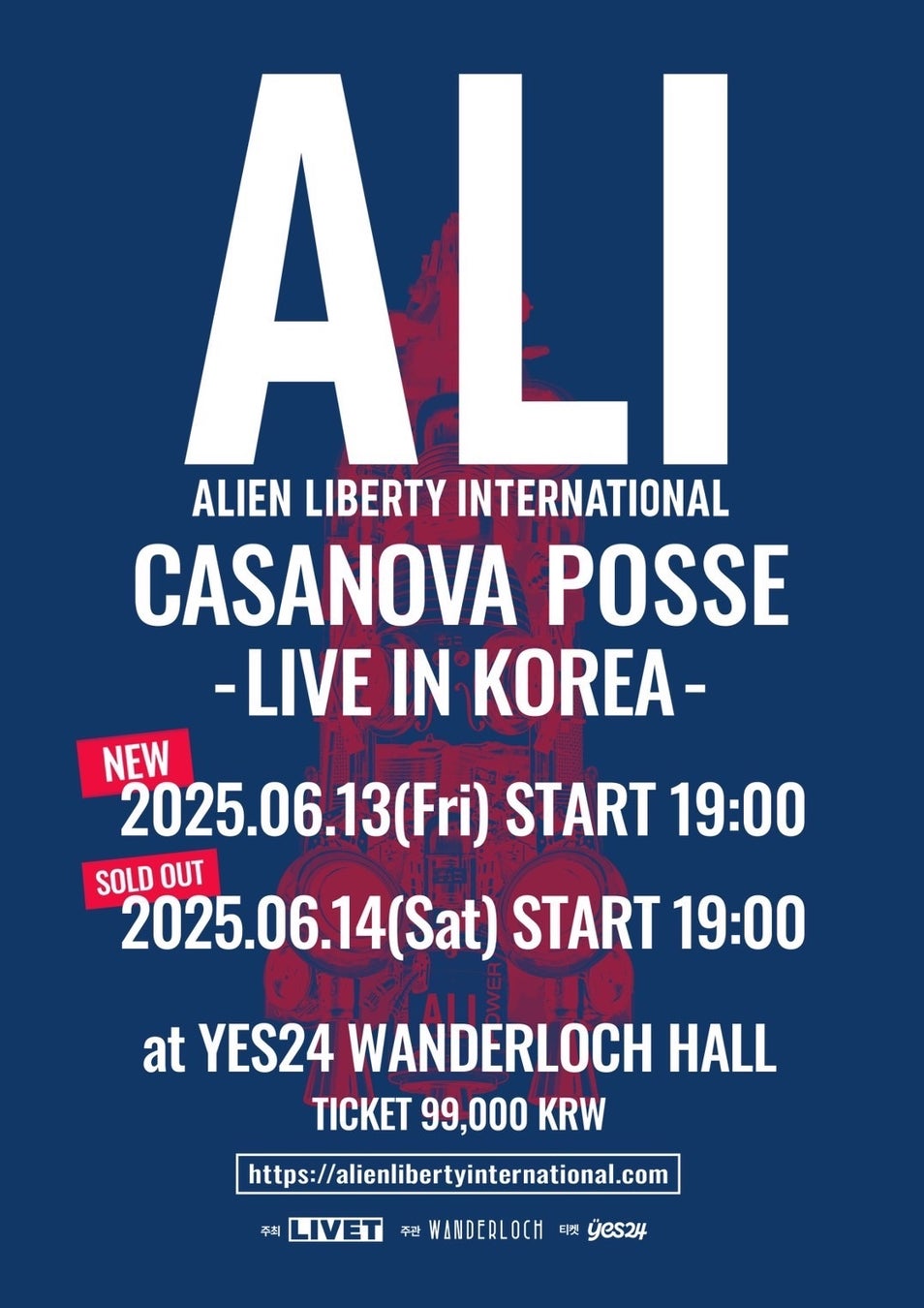 ALIは5月23日の上海公演を皮きりに、世界6都市7公演のALI “CASANOVA POSSE” ASIA TOUR 2025を開催。6月14日に開催されるソウル公演は、発売開始2分でチケットが即完し、急遽6月13日に追加公演の実施が決定した。