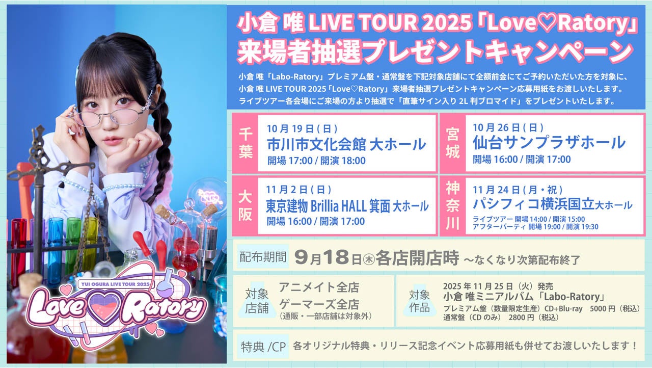 小倉 唯 11月25日(火) 発売「Labo-Ratory」プレミアム盤・通常盤を下記対象店舗にて全額前金にてご予約いただいた方を対象に、小倉 唯LIVE TOUR 2025 「Love♡Ratory」来場者抽選プレゼントキャンペーンの抽選番号が記載された応募用紙をお渡しいたします。